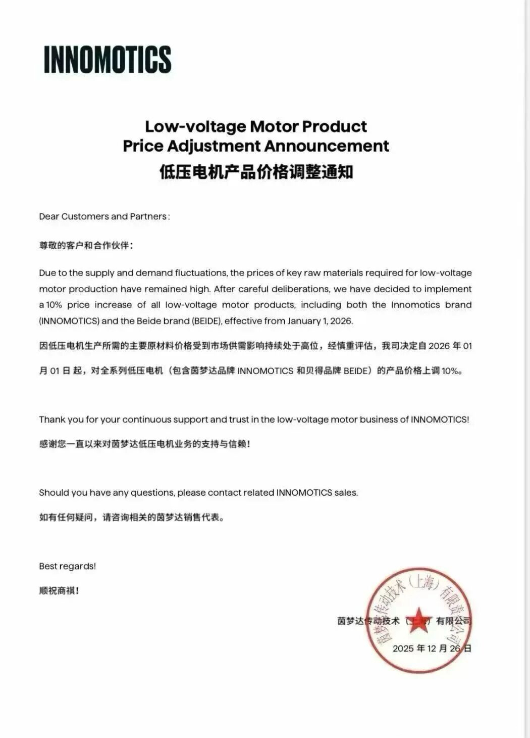 INNOMOTIGS Low-voltage Motor ProductPrice Adjustment Announcement